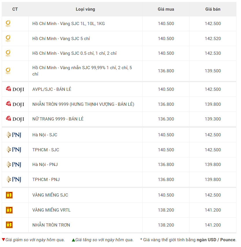 Các thương hiệu SJC, DOJI, PNJ, Bảo Tín Minh Châu đồng loạt niêm yết giá vàng miếng ở mức 140,5 – 142,5 triệu đồng/lượng (mua vào – bán ra), đi ngang ở cả hai chiều.