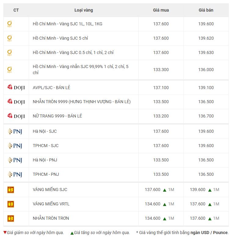 DOJI (HN & SG): mua 136,600,000 ₫ / bán 138,600,000 ₫