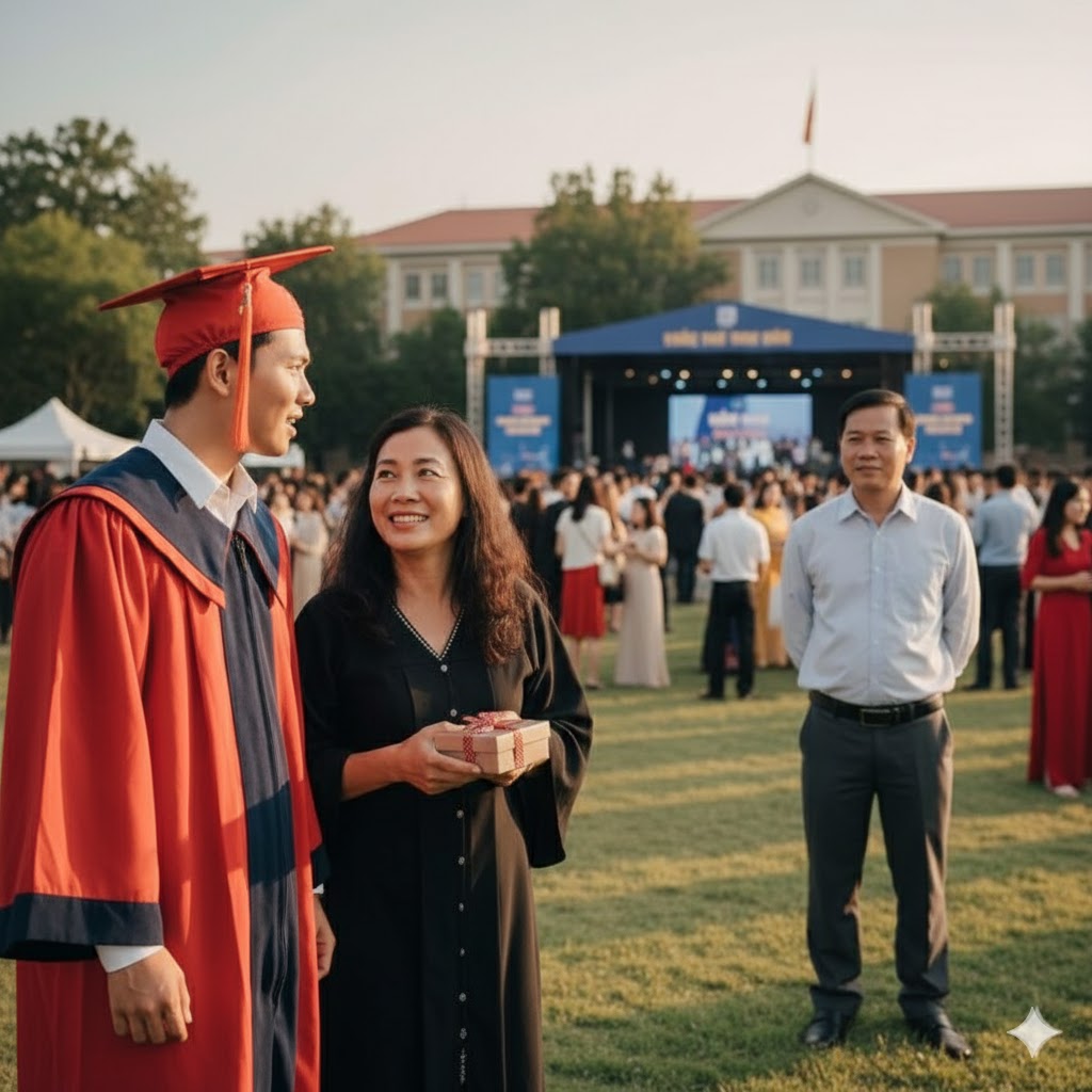 Sáng hôm sau, sân trường đông nghịt. Sinh viên mặc áo choàng, đội mũ cử nhân, từng nhóm gia đình ríu rít cười nói.